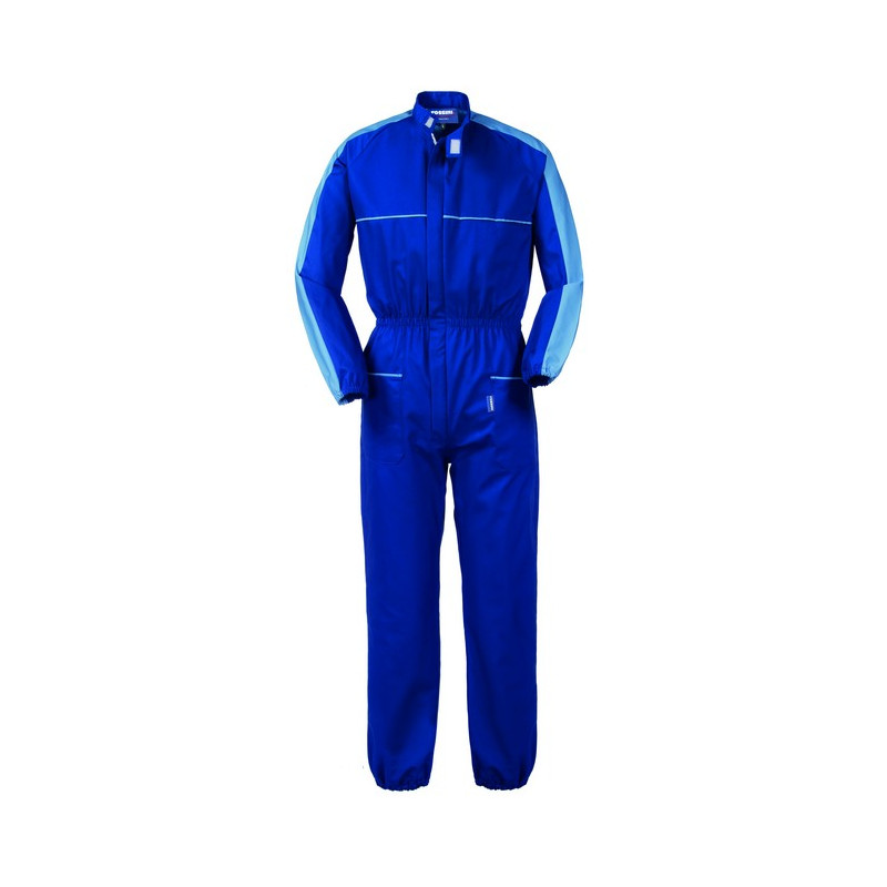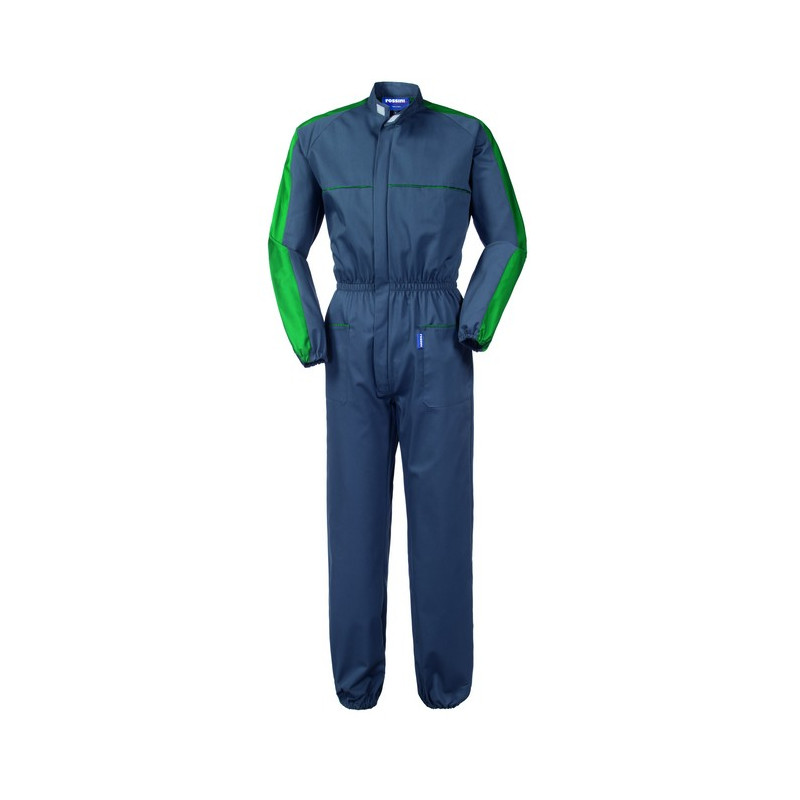 Tuta da lavoro con chiusura centrale con zip a doppio cursore coperta da patella, carré posteriore di colore a contrasto, inserti su spalle e maniche, profili al petto e tasche di colore a contrasto, collo alla coreana chiuso con velcro, maniche raglan. Due tasche anteriori applicate, un taschino a filetto al petto sinistro chiuso con velcro, una tasca posteriore applicata, elastico su tutto il girovita, elastico ai polsi e alle caviglie.