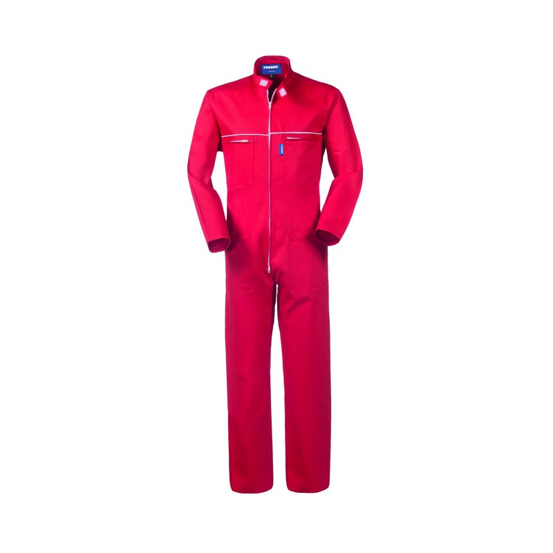 Visualizza ingrandito Tuta da lavoro con chiusura centrale con zip a doppio cursore coperta da patella, collo alla coreana chiuso con velcro, coda di topo di colore bianco al petto. Due tasche anteriori applicate, due taschini applicati al petto chiusi con cerniera, elastico in vita posteriore.