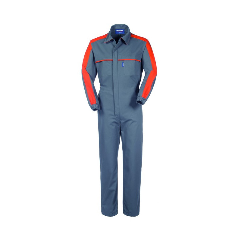 Visualizza ingrandito Tuta da lavoro con chiusura centrale con zip a doppio cursore coperta da patella, inserti su spalle e maniche e profilo al petto di colore arancio, collo a camicia con sottocollo di colore arancio. Due tasche anteriori interne chiuse con punto velcro, due taschini al petto applicati chiusi con cerniera coperta da aletta, elastico in vita posteriore, elastico ai polsi.