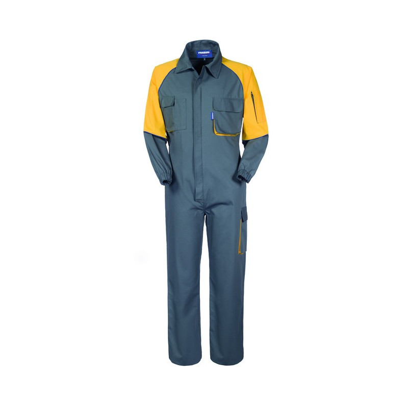 Visualizza ingrandito Tuta da lavoro con chiusura centrale con zip a doppio cursore coperta da patella, profilo blu rifrangente inserito nella cucitura delle maniche a raglan, collo a camicia. Un tascone applicato su gamba sinistra con soffietto laterale di colore giallo chiuso con aletta e velcro, un taschino applicato al petto sinistro con soffietto laterale di colore giallo chiuso con aletta e velcro, un taschino porta cellulare applicato al petto destro con soffietto laterale di colore giallo chiuso con aletta e velcro, una tasca portapenne applicata al petto destro, un taschino applicato alla manica sinistra chiuso con cerniera, elastico invita posteriore, elastico ai polsi.