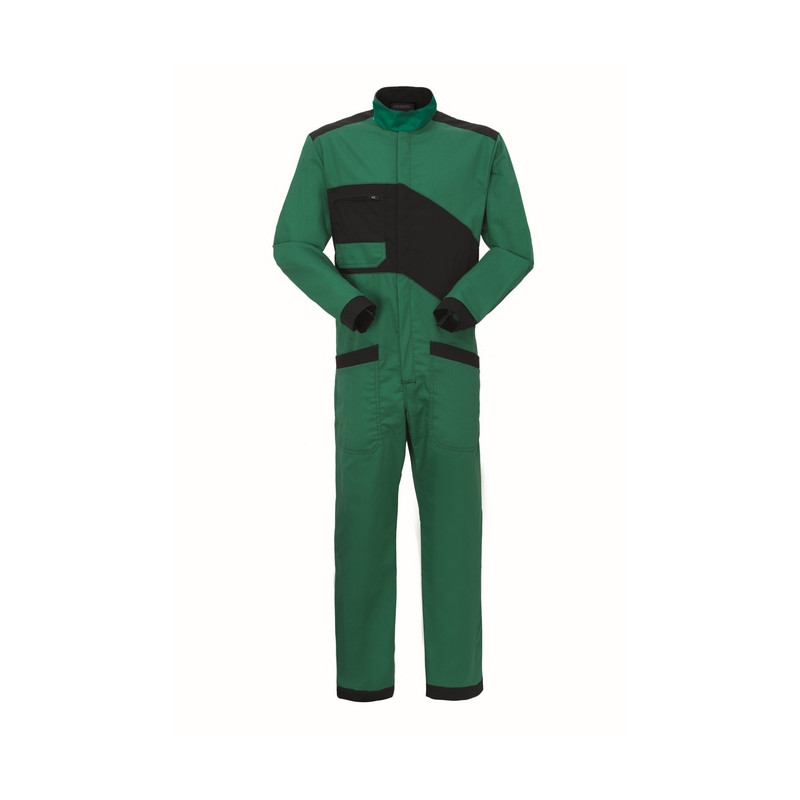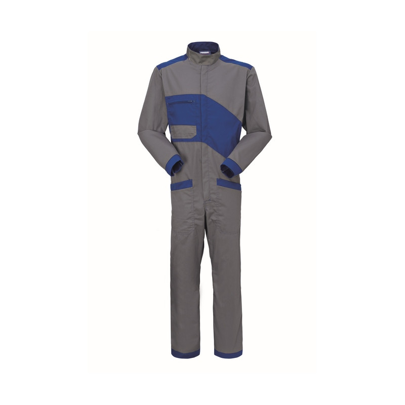 Tuta da lavoro con chiusura centrale con zip a doppio cursore coperta da patella, collo alla coreana chiuso con velcro. Un taschino applicato al petto destro chiuso con cerniera, due tasche inferiori applicate con profilo di colore a contrasto, elastico posteriore in vita, fondo manica dritto richiudibile con velcro. Profilo di colore a contrasto al fondo gamba e manica, inserto in tessuto di colore a contrasto sul petto e sulle spalle.