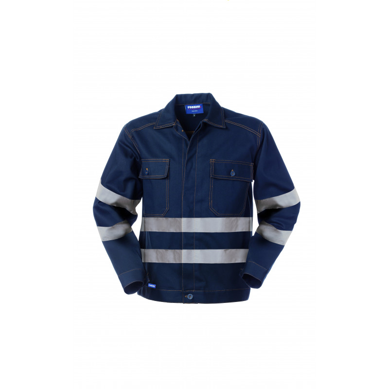 Giubbetto da lavoro con chiusura anteriore con bottoni coperti. Due taschini al petto chiusi con aletta e bottone, polsi chiusi con bottone. Carré posteriore, doppie bande rifrangenti applicate alle maniche e al girovita, cuciture di colore a contrasto.